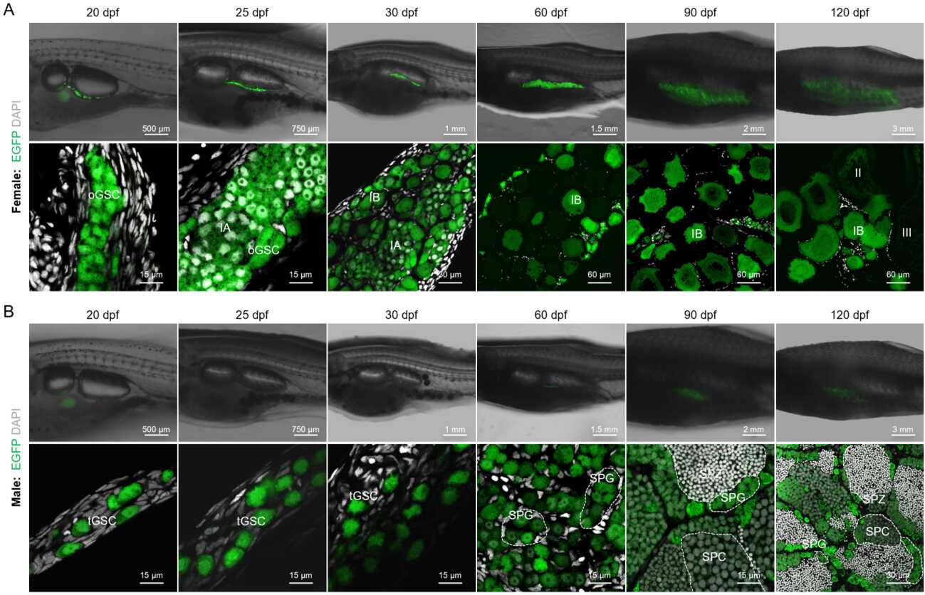 研究团队利用Tg(ddx4:egfp-UTRddx4)转基因品系,系统刻画了稀有鮈鲫的配子发生与性腺分化的全时相过程,与斑马鱼不同的是,受精后20 dpf时期生殖细胞的数目,而非早期PGC数目,决定了晚期的雌雄性分化(图1)。